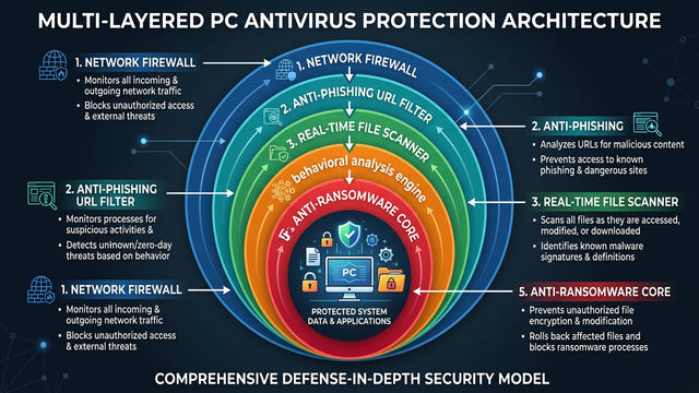 The weakest free antivirus products rely solely on signature-based scanning — matching files against a known malware database. While this catches yesterday’s threats, it is fundamentally inadequate against the 450,000+ new malware variants discovered daily according to 2026 AV-TEST Institute reporting. Best-in-class free antivirus software builds protection across multiple, complementary layers: