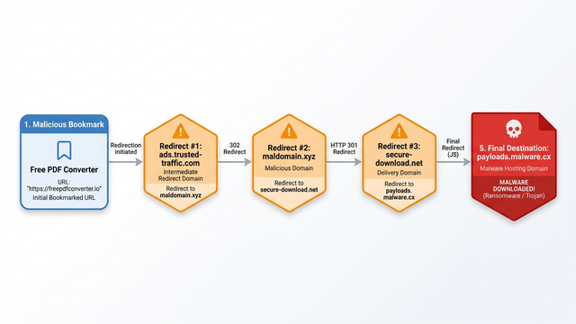 - Redirect Chains: A bookmark labeled something innocuous like ‘Free PDF Converter’ or ‘Online Image Editor’ may initially point to a legitimate-looking landing page. Behind the scenes, a chain of redirects — sometimes passing through three to five intermediate domains — routes the user to a final malware-hosting destination. Each intermediate domain in the chain may appear clean to basic URL scanners, making detection difficult.
